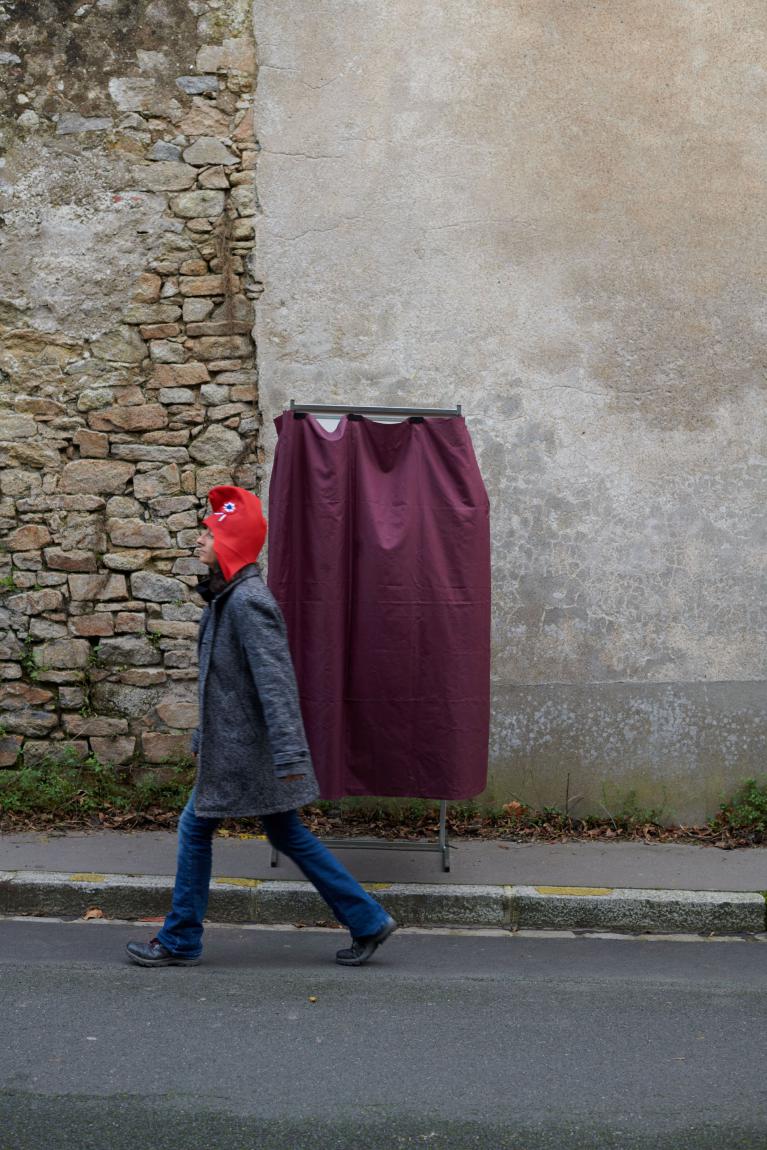 Un isoloir fatigué, manque des bouts, il est pété... Posé à même le sol, à peine reconnaissable. Quelqu’un-e a dû s’en débarrasser. De rage ? De désespoir ? Un ou une passant.e trébuche sur l’objet. De là, imaginons, se tisse une sorte d’échange entre l’humain.e et l’objet, entre un.e ou des citoyen.nes et le porte-voix de notre république démocratique française.